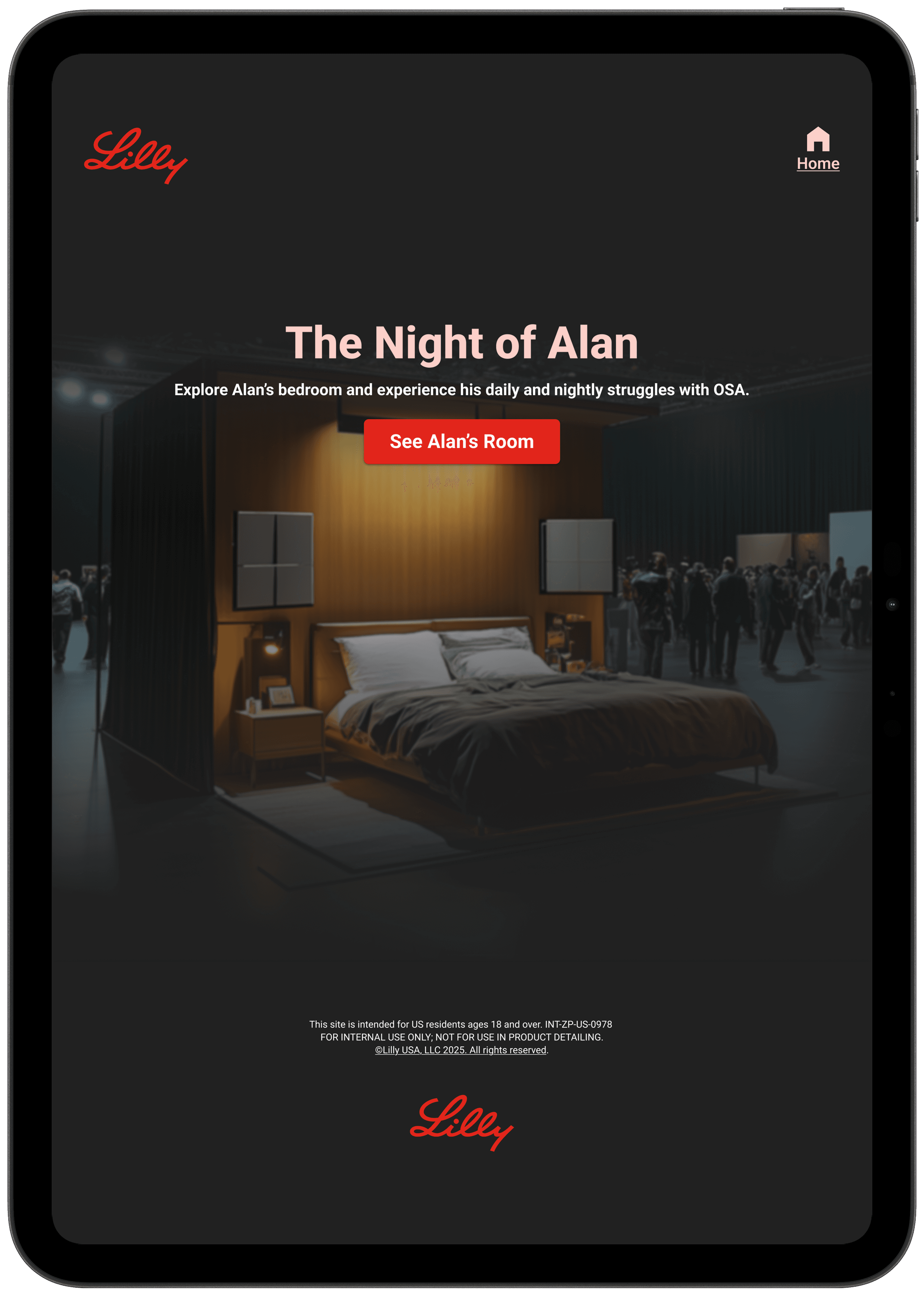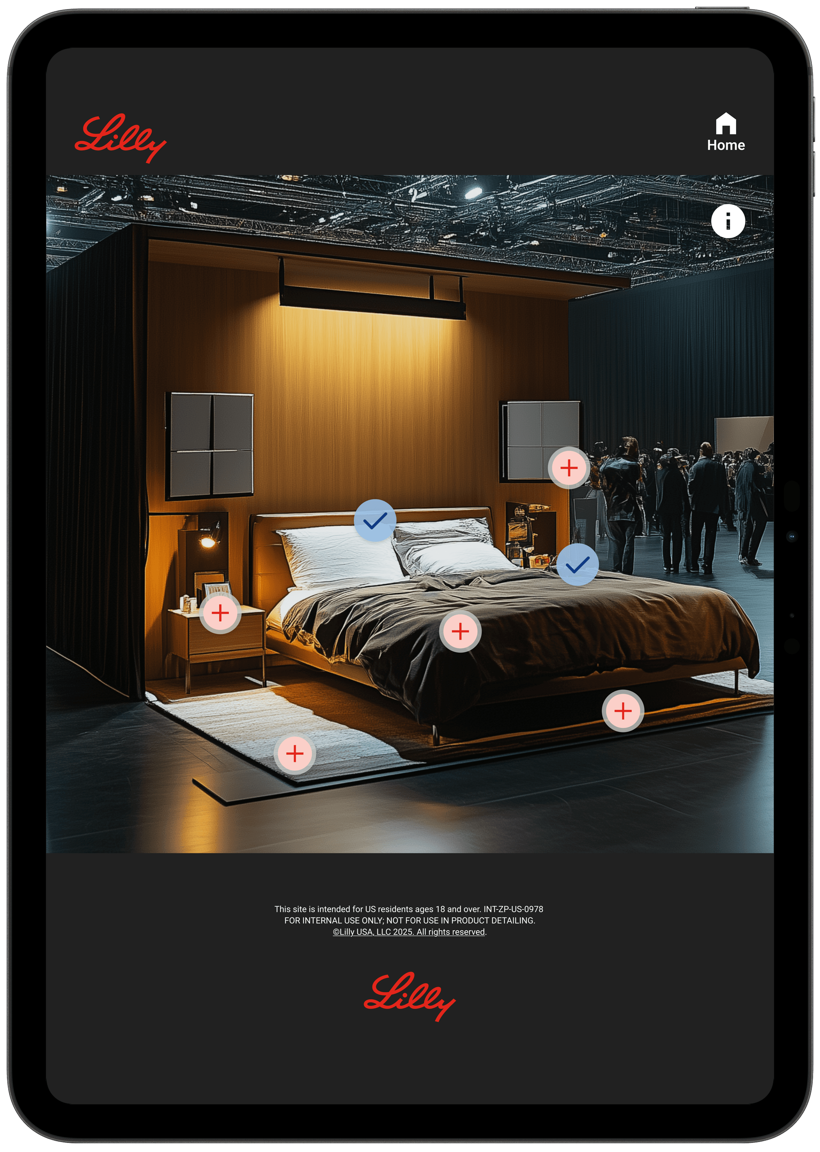 Lilly needed an interactive mobile and tablet microsite to support their conference booth, where healthcare professionals explored a simulated patient room illustrating life with OSA (Obstructive Sleep Apnea). Attendees could scan QR codes on objects or tap microsite hotspots to access short videos highlighting the daily challenges faced by patients with OSA.