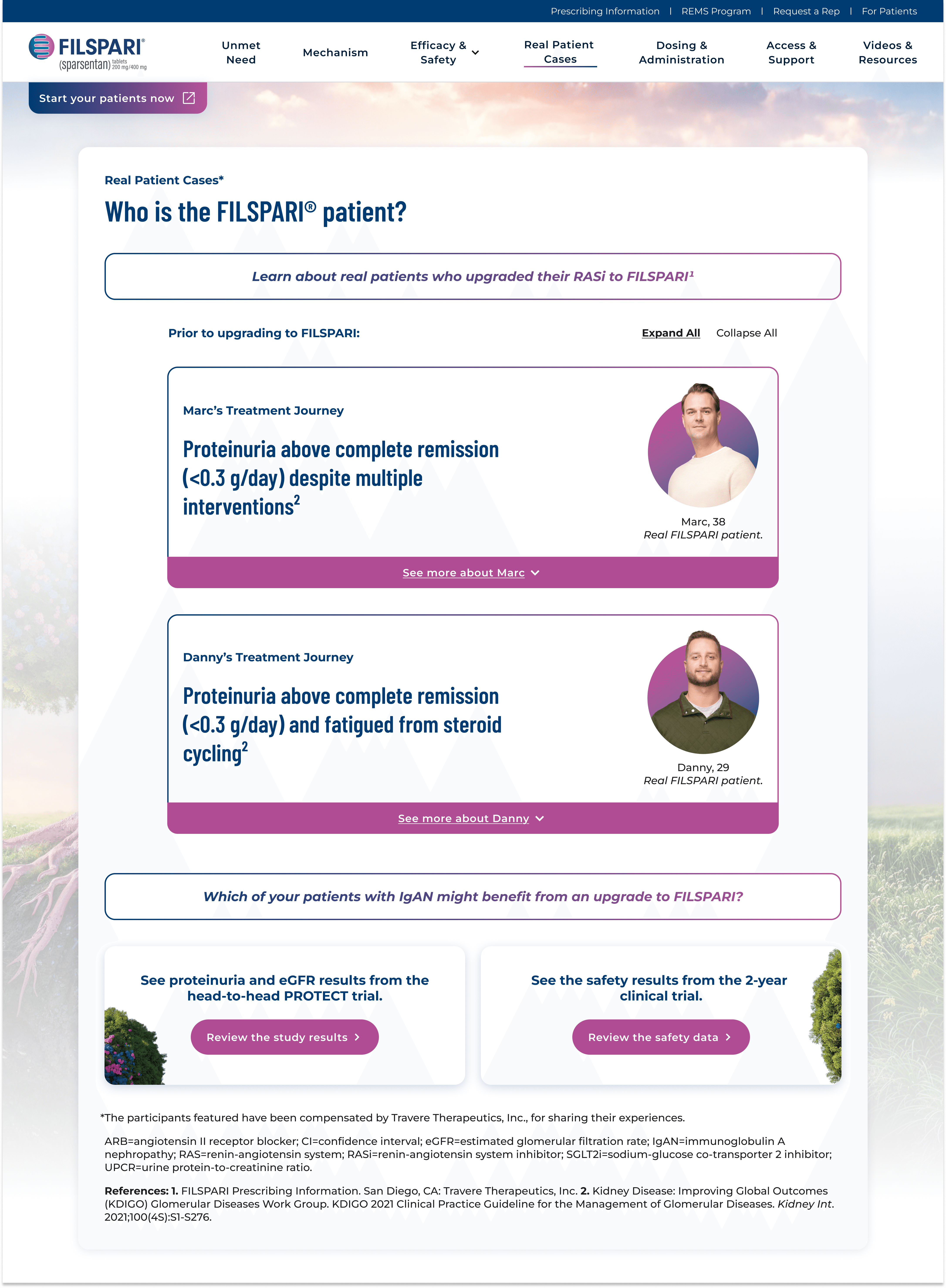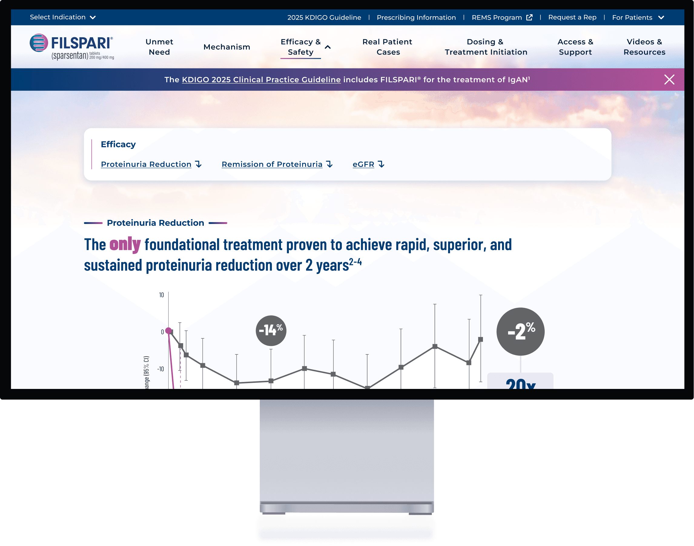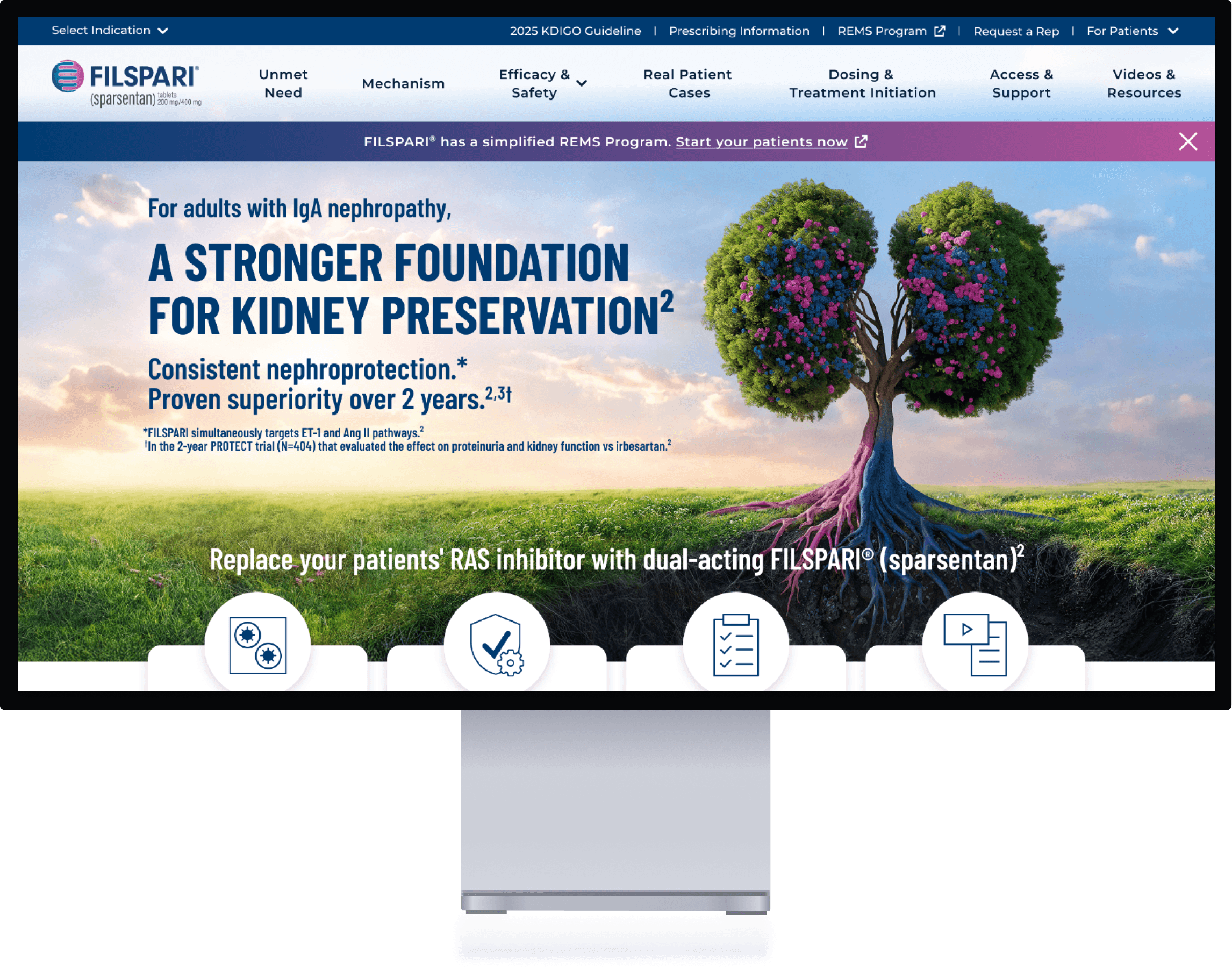 We redesigned this healthcare professional website with a strong focus on elevating its visual design while streamlining content and improving usability. A key goal was to bring more of the campaign’s visual storytelling into the homepage and broader site experience—creating a cohesive, modern aesthetic that better reflected the brand. At the same time, we refined layout, hierarchy, and navigation patterns to make clinical information easier to scan and access, resulting in a cleaner, more intuitive experience across devices.
